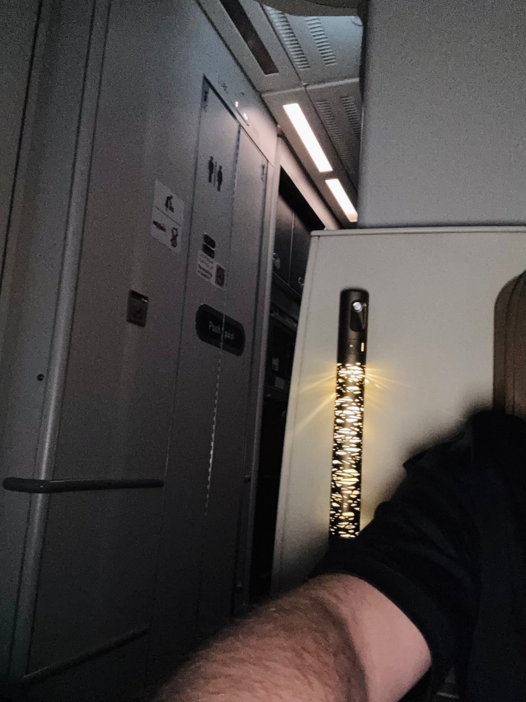 The crew bustle by constantly. Doors loom ominously at either side. Lavatories hiss and clunk in stereo. The smell drifts over intermittently like an unwelcome reminder that luxury, in this instance, is merely decorative.